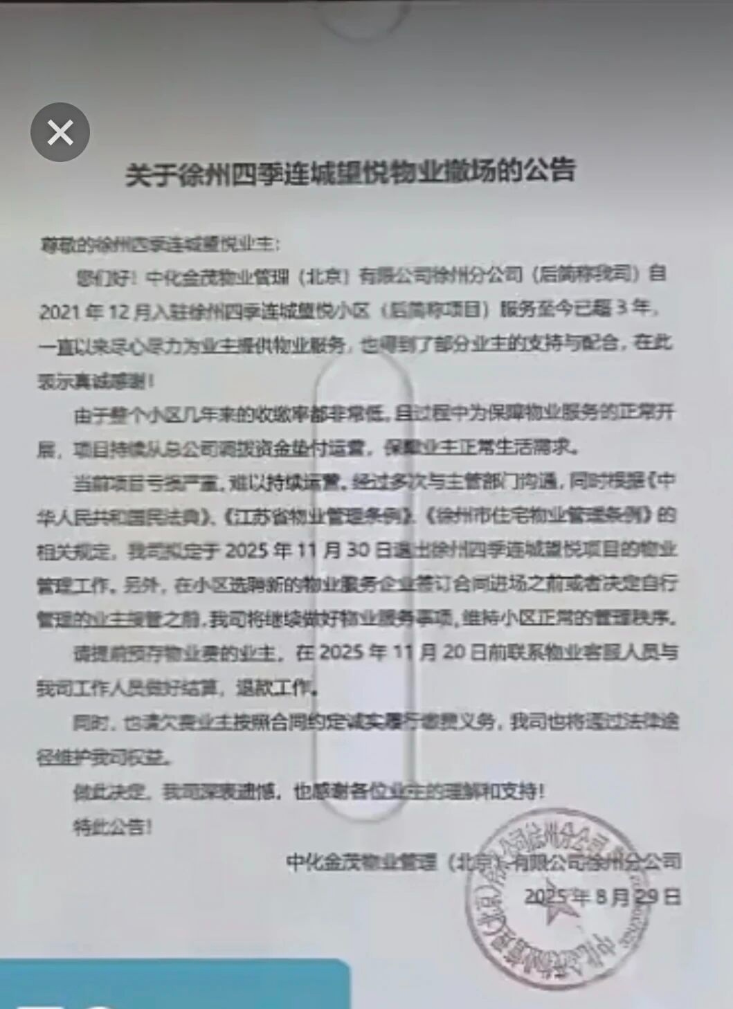 徐州四季连城望悦小区发布公告:中化金茂物业将于2025年11月30日正式撤出。